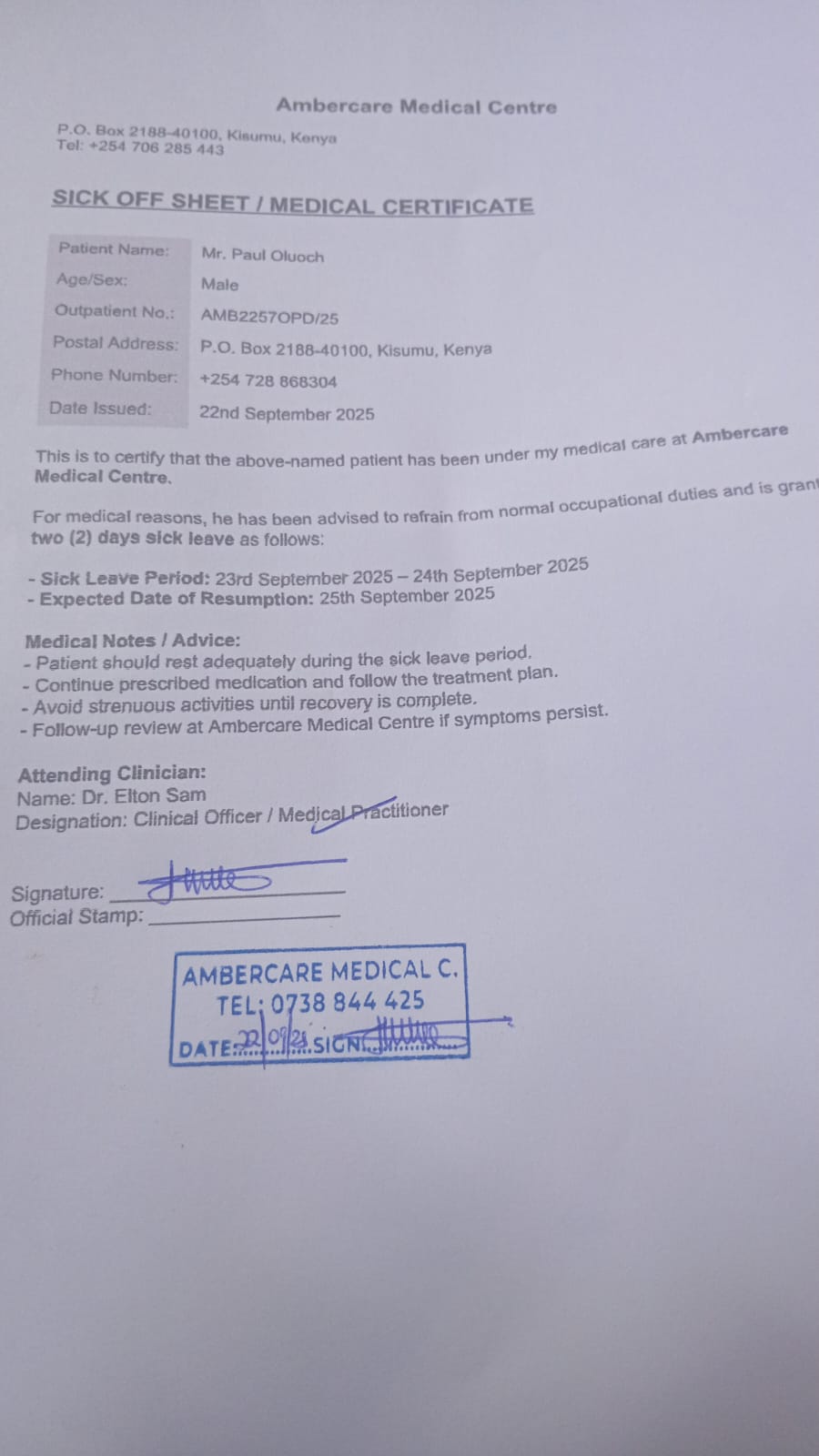 ID: AMK063 Name: Odhiambo, Charles Odhiambo |